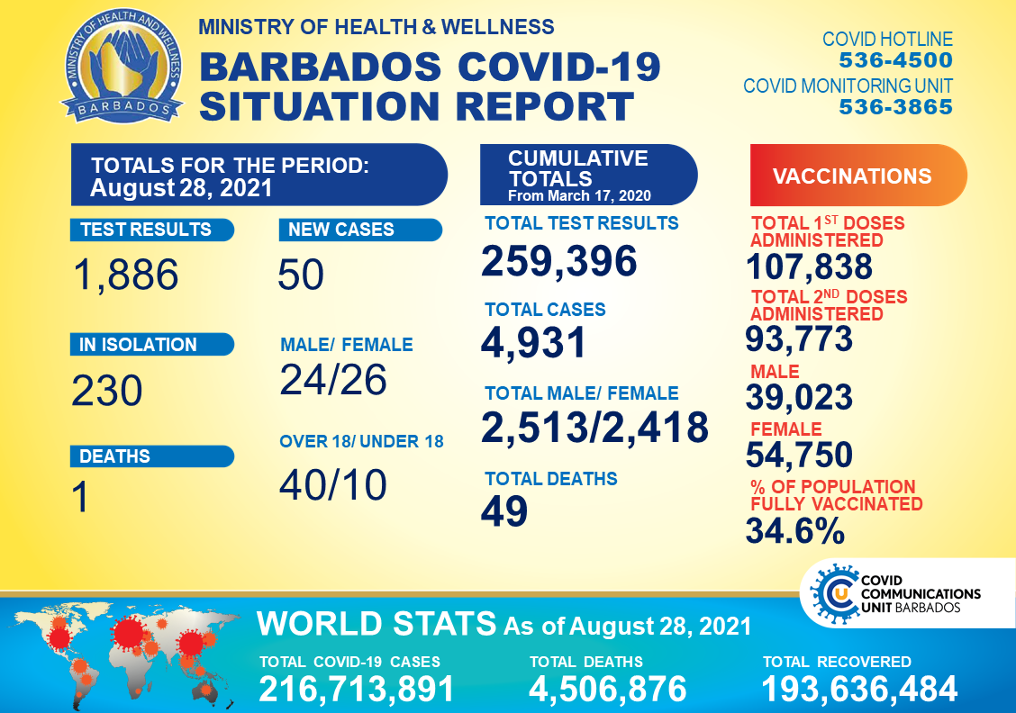 Covid-19Local NewsNews COVID-19 UPDATE: 50 new cases, 230 in isolation, one death by Barbados Today 29/08/2021 written by Barbados Today Updated by Desmond Brown 29/08/2021 1 min read A+A- Reset FacebookTwitterLinkedinWhatsappEmail 274 The Best-dos Santos Public Health Laboratory has reported 50 new cases of COVID-19 – 24 males and 26 females. Tests carried out on Saturday, August 28, numbered 1,886. Of the 50 new positives, 40 persons are over 18 years old and 10 are under the age of 18. One person, a 58-year-old woman, passed away from the virus yesterday after spending eight days in isolation. She had no underlying conditions and was unvaccinated. Her death brings the number of casualties from COVID-19 to 49. There are currently 230 people in isolation. Barbados has recorded 4,931 confirmed cases of the viral illness (2,418 females and 2,513 males) since March last year. The public health laboratory has, to date, conducted 259,396 tests. You Might Be Interested In Crystal Beckles-Holder, 2nd runner up in regional competition GUYANA: Body of child found after gold mine collapses Barbadians asked to help with return tickets for Haitians The National Vaccination Programme has seen 107,838 people receive first doses of the COVID-19 vaccines, while 93,773 persons – 39,023 males and 54,750 females – have been given second doses. Those who are fully vaccinated represent 34.6 per cent of the population. (BGIS) Barbados Today Stay informed and engaged with our digital news platform. The leading online multimedia news resource in Barbados for news you can trust. You may also like Sarah Ann Gill remembered as champion of faith, freedom and equality 26/04/2026 DLP marks 71 years with call for renewal 26/04/2026 Mottley calls for renewed commitment amid global challenges 26/04/2026