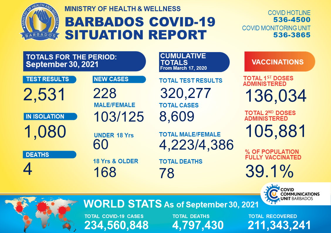 Covid-19Local NewsNews COVID-19 update: 228 new cases, four deaths, 1,080 in isolation by Barbados Today 01/10/2021 written by Barbados Today Updated by LuovaSupport 01/10/2021 1 min read A+A- Reset Share FacebookTwitterLinkedinWhatsappEmail 248 There were 228 new cases (103 males and 125 females) of COVID-19 recorded by the Best-dos Santos Public Health Laboratory on Thursday, September 30. The facility conducted 2,531 tests. Of those testing positive, 60 persons are under 18 years old, and 168 are age 18 and older. There are currently 1,080 persons in isolation. Four persons, who all had comorbidities, passed on Thursday. Three of them, a 47-year-old male, a 79-year-old female, and an 81-year old female were unvaccinated. A 67-year-old female was fully vaccinated. Their deaths bring the number of persons who have died from the virus to 78. Since March 2020, Barbados has 8,609 confirmed cases – 4223 males and 4,386 females – of COVID-19. You Might Be Interested In Crystal Beckles-Holder, 2nd runner up in regional competition GUYANA: Body of child found after gold mine collapses Barbadians asked to help with return tickets for Haitians A total of 320,277 tests were performed by the public health laboratory. Under the National Vaccination Programme, 136,034 first doses were administered, and 105,881 persons, or 39.1 per cent of the population, have received second doses and are fully vaccinated. (BGIS) Barbados Today Stay informed and engaged with our digital news platform. The leading online multimedia news resource in Barbados for news you can trust. You may also like Responsible governance key after landslide win, says clergyman 22/02/2026 Man due in court on affray, firearm charges 22/02/2026 Christ Church man to be sentenced in March for unlicensed firearm, ammo 22/02/2026