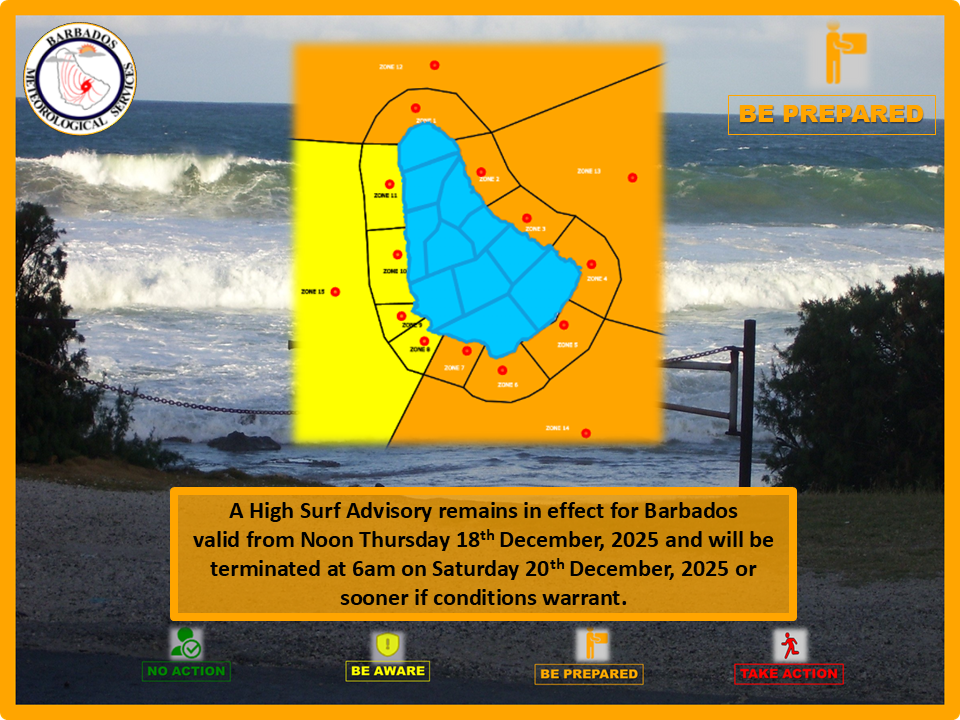 Local NewsWeather Small craft, high surf advisory remains in effect as rough seas persist by Barbados Today 18/12/2025 written by Barbados Today Updated by Hiltonia Mariate 18/12/2025 1 min read A+A- Reset Share FacebookTwitterLinkedinWhatsappEmail 73 A Small Craft and High Surf Advisory remains in effect for Barbados as rough sea conditions continue to affect the island’s coastal and marine areas. The Barbados Meteorological Services (BMS) said sea conditions remain agitated due to strong Atlantic winds, with open-water swells ranging between 2.5 and 3.0 metres. These conditions are expected to persist through the remainder of the week, before improving over the weekend. As a result, small craft operators are being warned that large swells could make marine operations difficult and hazardous. The advisory also notes the risk of beach erosion, particularly along the northern, eastern and southern coastlines, with some beaches likely to be submerged at times of high tide. There is also the possibility of injury or loss of life if safety precautions are not followed. Marine users and beachgoers are being urged to exercise caution and to follow advice issued by the National Conservation Commission and other relevant authorities. The public is also encouraged to monitor updates from the Barbados Meteorological Services, the Department of Emergency Management and the Barbados Government Information Service. According to the BMS, the unsettled conditions are being driven by an Atlantic high-pressure system generating winds of 20 to 30 knots, keeping seas rough despite a slight easing in swell heights.The advisory is expected to remain in effect until 6 a.m. on Saturday, December 20, or sooner if conditions improve. You Might Be Interested In Today’s weather Cabinet approves shutdown procedures Barbados to announce ‘heat wave’ response For more information, members of the public can visit the Barbados Meteorological Services website or contact its hotline at 976-2376. Barbados Today Stay informed and engaged with our digital news platform. The leading online multimedia news resource in Barbados for news you can trust. You may also like Atherley rules himself out of February 11 election 19/01/2026 BADMC to review yam prices by April 19/01/2026 New coalition pushes for reform, fairer representation, voter re-engagement 19/01/2026