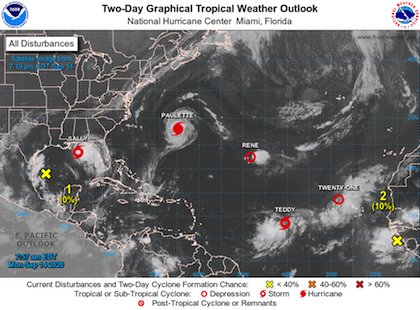 NewsStorm WatchWeather WEATHER WATCH – Four named storms, one depression and two other systems by Barbados Today 14/09/2020 written by Barbados Today Updated by Fernella Wedderburn 14/09/2020 1 min read A+A- Reset Share FacebookTwitterLinkedinWhatsappEmail 321 The Atlantic is packed with activity today with four named storms, one depression and two other weather systems churning in the North Atlantic, the Caribbean Sea and the Gulf of Mexico. This morning the National Hurricane Centre (NHC) based in Miami issued advisories on Hurricane Paulette, located near Bermuda; Tropical Depression Rene, located over the Central Atlantic; Tropical Storm Sally, centered over the north-central Gulf of Mexico; recently upgraded Tropical Storm Teddy, located over the east-central tropical Atlantic; and on newly formed Tropical Depression Twenty-One, located over the eastern tropical Atlantic. The forecasters were also monitoring disorganised showers and thunderstorms over the western and southwestern Gulf of Mexico, associated with a weak area of low pressure. However development of this system was โnot expected due to strong upper-level winds while it moves slowly southwestward and then southward over the western Gulf of Mexico during the next few days.โ The other system was a tropical wave near the west coast of Africa which is producing disorganised shower and thunderstorm activity. โEnvironmental conditions appear to be conducive for slow development of the system this week as the wave moves westward at about 10 mph over the far eastern tropical Atlantic,โ the NHC reported. You Might Be Interested In Crystal Beckles-Holder, 2nd runner up in regional competition Business owners disappointed Police investigate shooting There have been 19 named storms so far this Atlantic Hurricane Season โ Arthur, Bertha, Cristobal, Dolly, Edouard, Fay, Gonzalo, Hanna, Isaias, Josephine, Kyle, Laura, Marco, Nana and Omar; while Paulette, Rene, Sally and Teddy are currently churning in the North Atlantic, the Caribbean Sea and the Gulf of Mexico. (NHC/BT) Barbados Today Stay informed and engaged with our digital news platform. The leading online multimedia news resource in Barbados for news you can trust. You may also like Great Barbadian journalistโs last surviving child, is 100 06/02/2026 BLP promises new payment system to tackle chronic delays to contractors 05/02/2026 Gully board: Beesโ Nicholls pledges eco-tourism revival for St Thomasย 05/02/2026