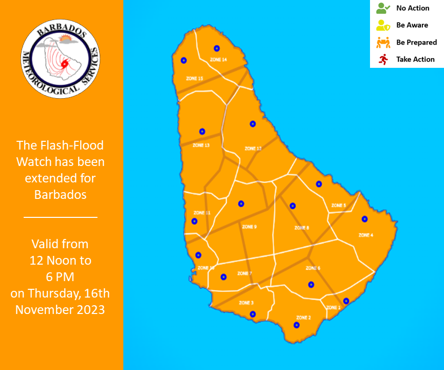 NewsWeather Public told to expect heavy to intense showers by Barbados Today 16/11/2023 written by Barbados Today Updated by Fernella Wedderburn 16/11/2023 1 min read A+A- Reset Share FacebookTwitterLinkedinWhatsappEmail 403 The Barbados Meteorological Services (BMS) is advising that a tropical wave will be affecting the island, bringing occasional heavy to intense showers, and as such, a flash flood watch remains in effect. The Met officials say rainfall accumulations up to an inch are possible throughout the afternoon. “Residents and visitors should also be aware that this [flash flood] alert level could elevate to red,” the BMS said. The public is being told to expect possible moderate to significant runoff from higher elevations; soil erosion on exposed or scarred land surfaces; water settlements on roads and fields at the foot of hills and coastal roads; adjustments to water levels of existing water bodies (ponds etc.); objects or debris from higher elevations becoming embedded within fast-moving water flows; and delays on traffic routes with some roads becoming impassable in and out of minor towns. The flash flood watch, which went into effect at noon, will be terminated at 6 p.m. or sooner if conditions warrant. The flash flood watch is issued when heavy or excessive rainfall in a short period of time (generally less than 6 hours) could result in flash flooding within the watch area. It does not mean that flooding will occur, but it is possible. Barbados Today Stay informed and engaged with our digital news platform. The leading online multimedia news resource in Barbados for news you can trust. You may also like Consett Bay fisherfolk upset over unannounced market repairs 13/03/2026 Dedicated โgun courtโ among new measures to speed justice 11/03/2026 Barbados seeks cleaner, smarter transport solutions amid rising vehicle numbers 11/03/2026