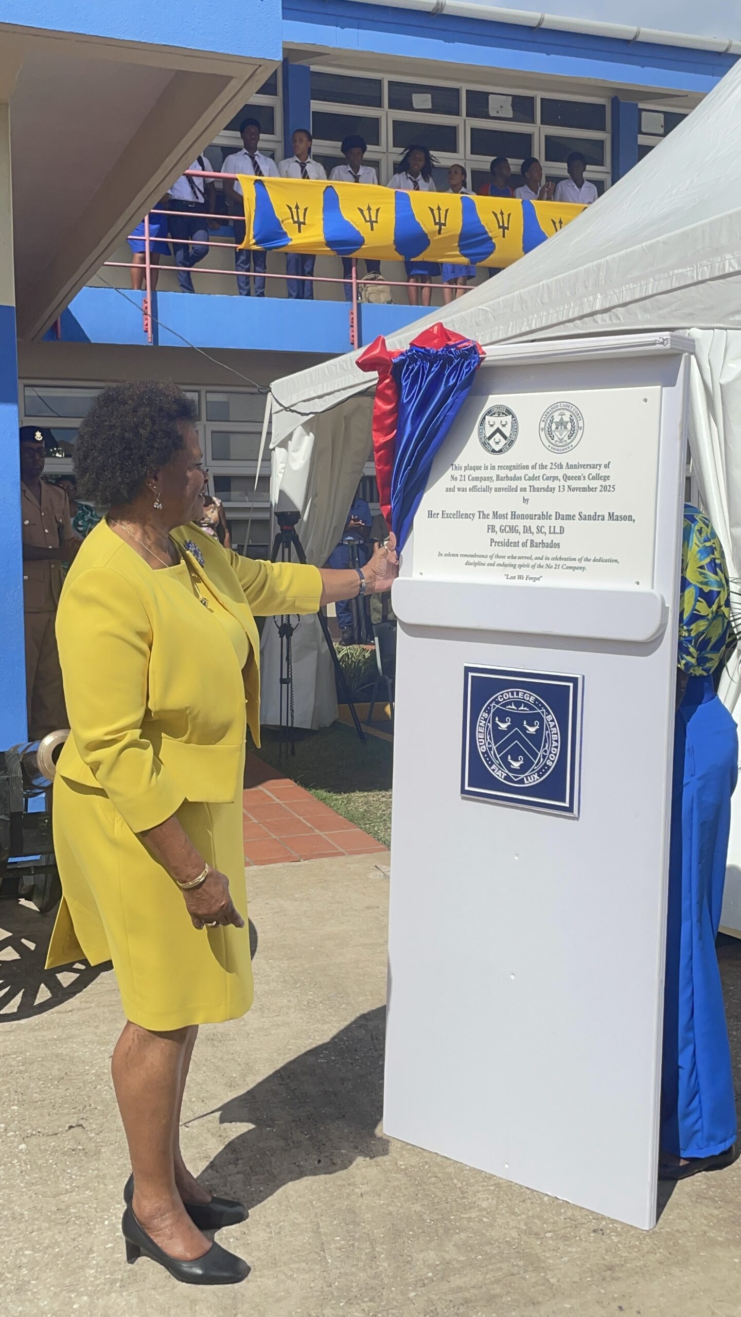 FocusLocal News President marks Queen’s College 25-year Cadet Corps milestone by Barbados Today 14/11/2025 written by Barbados Today 14/11/2025 2 min read A+A- Reset Share FacebookTwitterLinkedinWhatsappEmail 91 Queen’s College marked a quarter-century of its No. 21 Cadet Corps with a military parade and poignant Remembrance Day tribute on Thursday, as the President of the Republic led dignitaries, staff and students in commemorating generations of cadet excellence and civic service. President Dame Sandra Mason led the laying of wreaths at the Husbands, St James campus, followed by Ambassador to CARICOM David Comissiong, Major Pedro Drakes, representing Brigadier General Carlos Lovell, chair of the Queen’s College Board of Management, Lynda Holder, and principal Mitchelle Maxwell. Holder described the event as a moment of pride and reflection. “It is our honour to gather for this unveiling ceremony in recognition of the 25th anniversary of the No. 21 Cadet Company,” she said. “This milestone reflects 25 years of discipline, service, leadership, and pride in school and country.” She highlighted the contribution of those who have shaped the company’s legacy: “We celebrate the vision of our founders, the dedication of our officers and instructors, the steadfast support of parents and the wider scholars’ community, and most of all, the excellence of generations of cadets who have carried the colours of No. 21 with distinction.” Holder, a QC alumna and former cadet, spoke with personal pride: “Although I never carried the colours of the No. 21 Cadet Company, I am a product of the Cadet Corps… and I am claiming ownership as well.” You Might Be Interested In A simpler way to bank Make wise choices A family affair The ceremony also paid tribute to the island’s fallen soldiers. “We pause to acknowledge Remembrance Day — a solemn reminder of the courage, sacrifice, and unity shown by those who served in conflict,” Holder said. “Today’s unveiling is both a tribute and a charge — to those who built and sustained this company, and to our current cadets to uphold the highest standards of character, teamwork, and civic duty.” The school choir of both students and teachers, led by teacher Danielle Hinkson, delivered a stirring rendition of At Calvary, which was warmly received by the audience. The cadets demonstrated precision and discipline through drills and the playing of Reveille, traditionally performed in memory of the sacrifice of fallen soldiers, before a plaque was unveiled by President Mason. The inscription read: “In solemn remembrance of those who served, and in celebration of the dedication, discipline, and enduring spirit of the No. 21 Company. ‘Lest We Forget.’” Adding a touch of artistry and tradition to the ceremony, Head Boy Brandon Squires presented school memorabilia to the president, while Amaris Nicholls gifted her award-winning painting and Javier Martin offered a bouquet of flowers. (LE) Barbados Today Stay informed and engaged with our digital news platform. The leading online multimedia news resource in Barbados for news you can trust. You may also like St George man to face court on gun and six other charges 06/12/2025 A vision for a prosperous Barbados 06/12/2025 The UN is fading — We should worry 06/12/2025